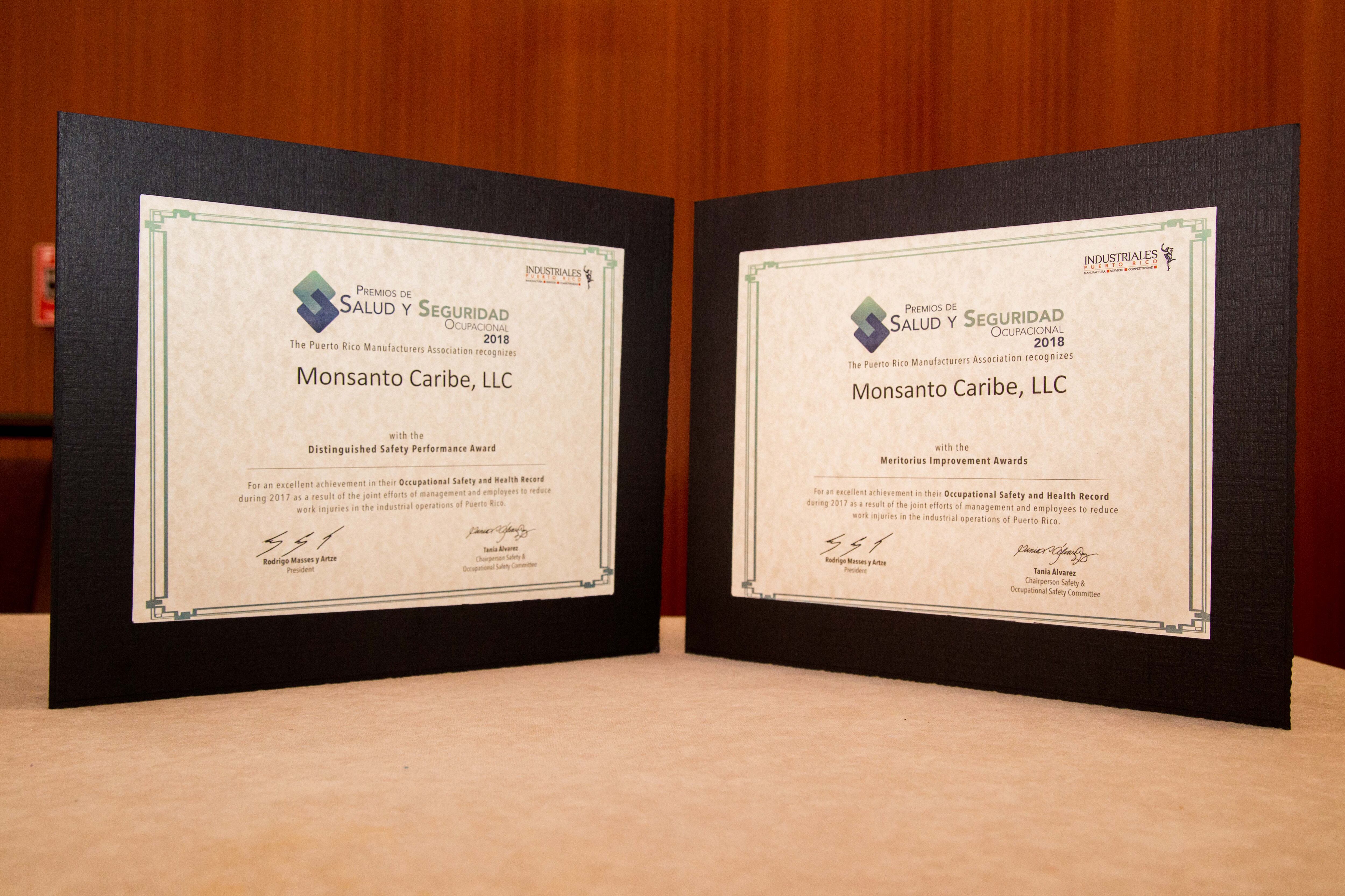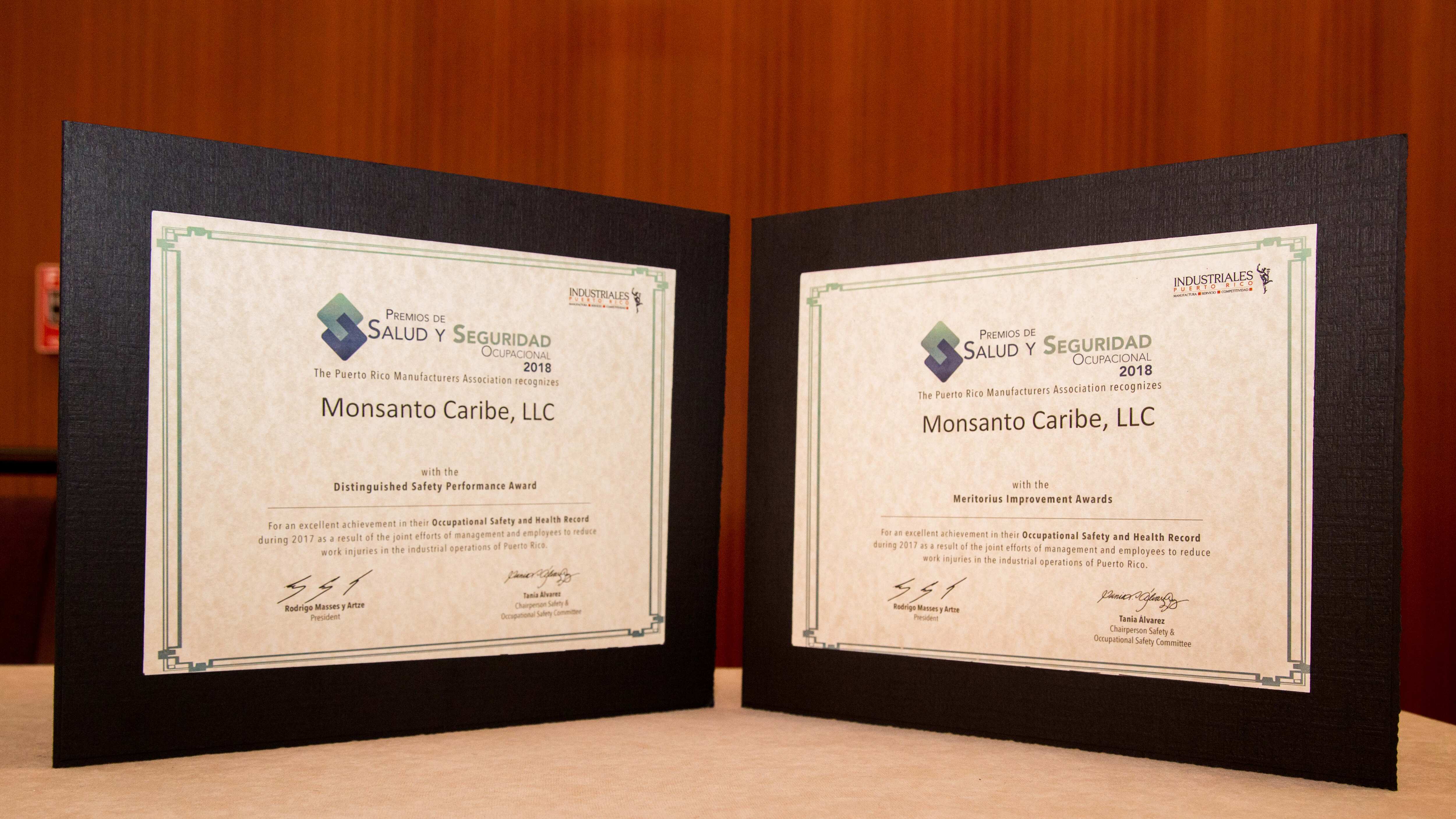 En el Taller Plan de Continuidad de tu Negocio, celebrado en el Sheraton Centro de Convenciones, la PRMA le otorgó a Monsanto dos (2) premios por sus logros en salud y seguridad ocupacional: el “Distinguished Safety Performance Award” y el “Meritorious Improvement Award”.
