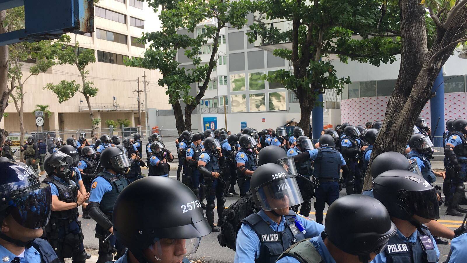 Efectivos de la División de Operaciones Tácticas han formado un cordón de seguridad y muy cerca, ante ellos, se ubican decenas de manifestantes, quienes buscan pasar frente al edificio donde tiene sus oficinas la Junta de Supervisión Fiscal (JSF) y también reunirse con el resto de los participantes de la concentración que se efectuó en el lugar.