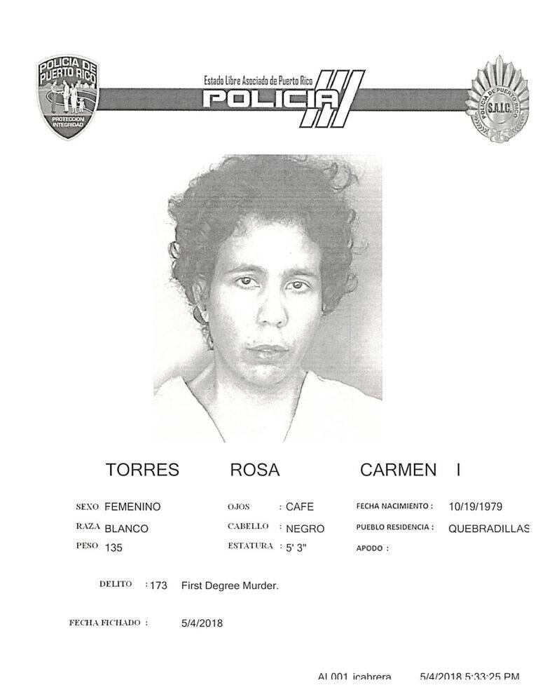 Esta tarde fue denunciada por un delito de asesinato en primer grado Carmen I. Torres Rosa, de 39 años de edad y quien ya estaba encarcelada por violencia doméstica por estos mismos hechos.
