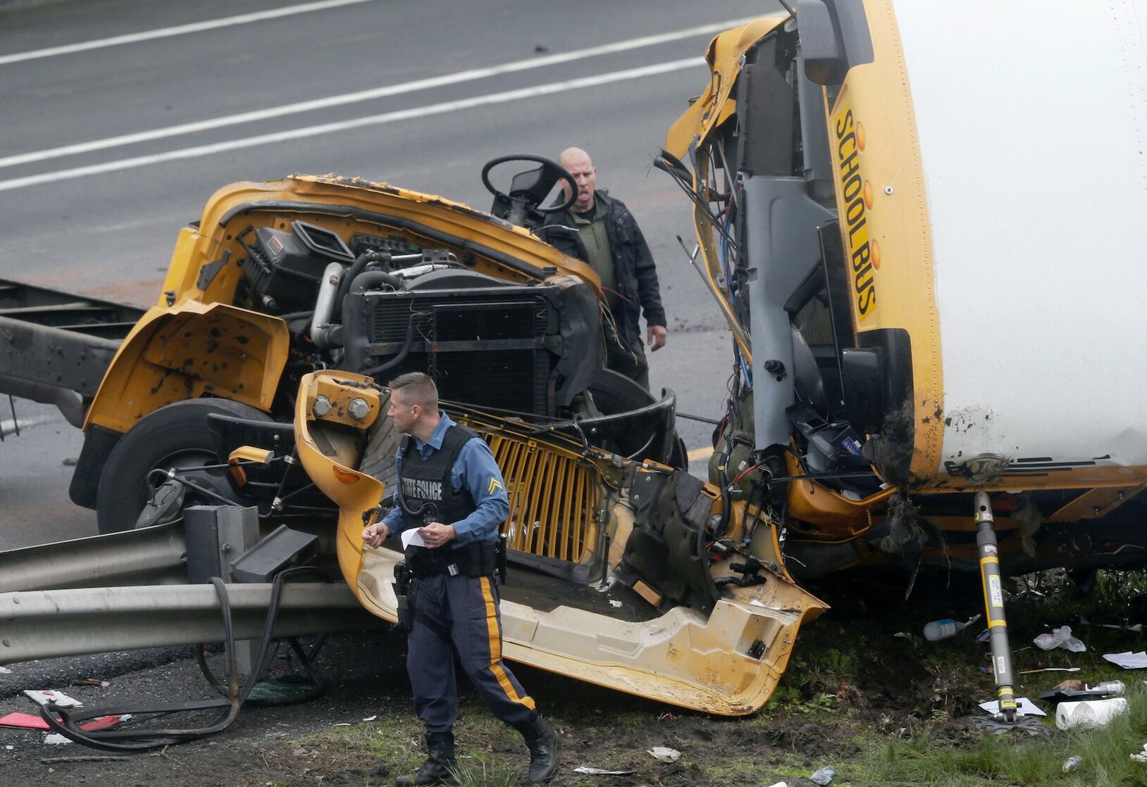 El autobús quedó tumbado sobre la Carretera Interestatal 80 en Mount Olive, con la parte delantera totalmente cercenada del resto del vehículo. Parte de su plataforma y un trozo del tablero quedaron al borde de la vía. El camión, con su parte delantera aplastada, estaba estacionado a pocos metros.