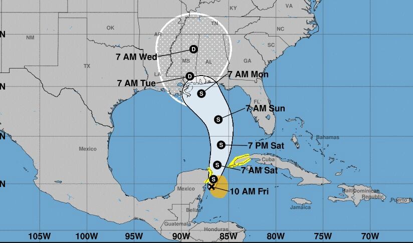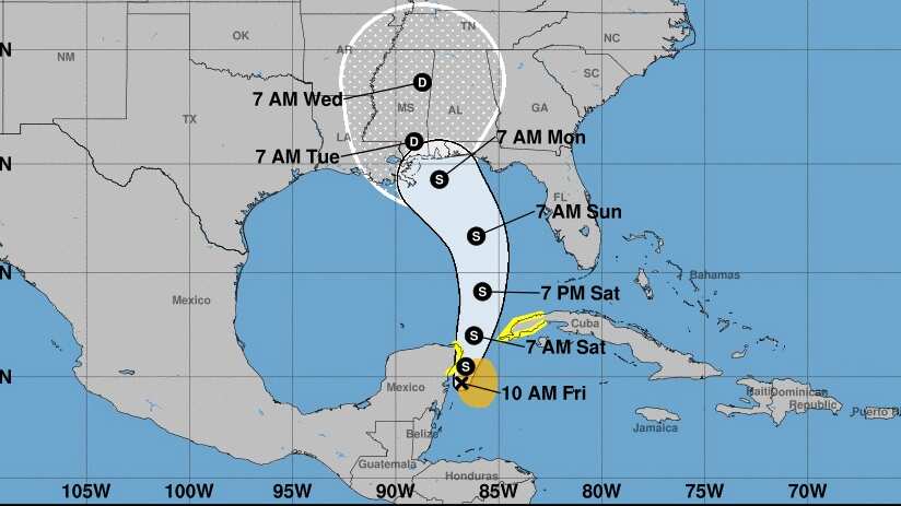 La tormenta se movía hacia el noreste a 9 km/h (6 mph). Se esperaba que el meteoro trajera fuertes lluvias a la península de Yucatán, el oeste de Cuba, Florida y la costa noreste del Golfo de México durante el fin de semana.