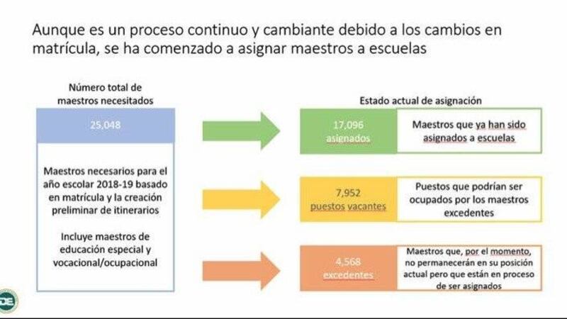 “En este momento, tenemos alrededor de unos 4,500 recursos disponibles que serán ubicados según las necesidades y las reglas. Bajo ninguna circunstancias deben verse como ‘afectados’ pues, sencillamente, serán relocalizados según dicta la realidad de la población estudiantil y el convenio colectivo. Además, repito, los maestros permanente mantendrán sus trabajos. Por ende, nadie se verá afectado”, agregó la Secretaria del Departamento de Educación (DE).