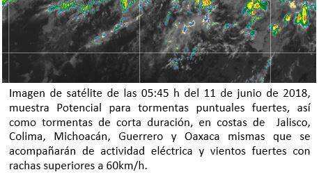 A los que se sumará ambiente caluroso y viento de dirección variable de 20 a 35 kilómetros por hora con rachas de 50 a 70 kilómetros por hora y oleaje de tres a cuatro metros en la costa de Jalisco, Colima y Michoacán.