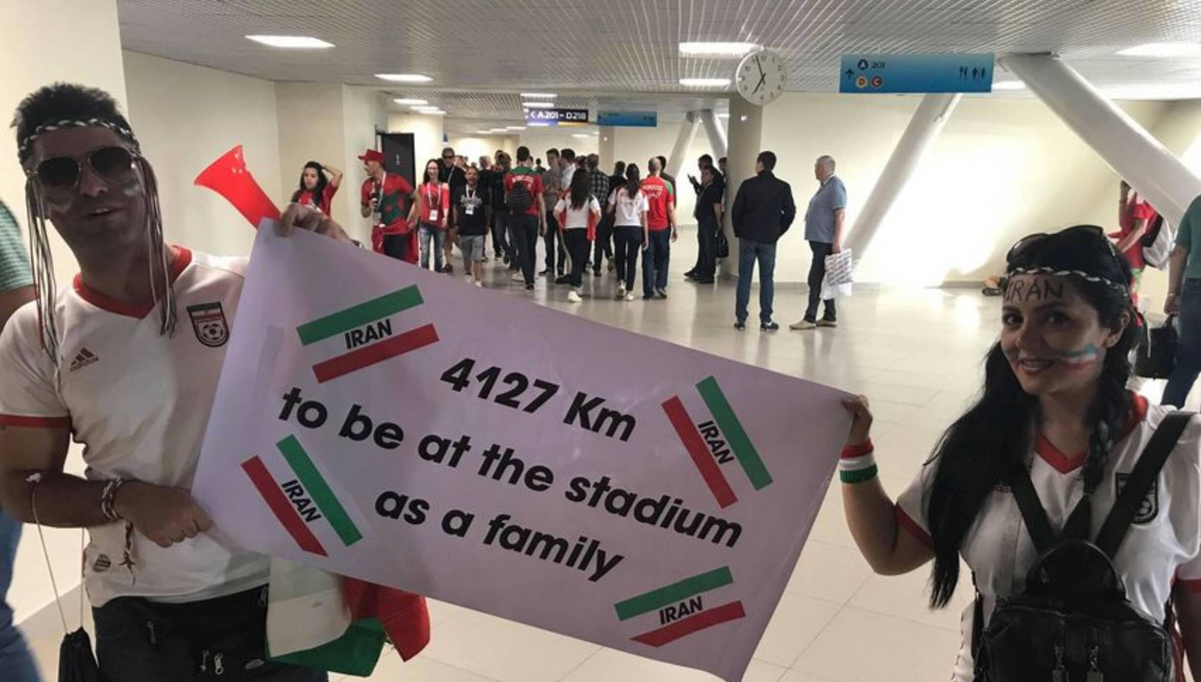 Metro conversó con el fanático del equipo nacional iraní Amin Rad y su esposa Alfie (nombre cambiado, quienes cruzaron 4.127 kilómetros para poder ver el fútbol “en el estadio como una familia”, como dice el póster que sostenían.