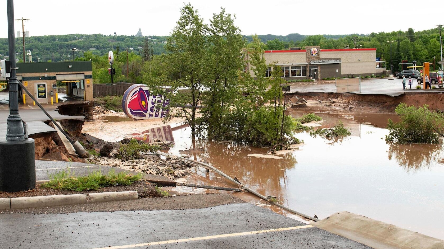 Las fuertes lluvias también inundaron calles en la zona norte de Minnesota. En partes de la península superior de Michigan, en donde se reportaron hasta 18 centímetros (7 pulgadas) de lluvia, ríos desbordados inundaron caminos y a su paso dejaron grandes trozos de concreto y asfalto.