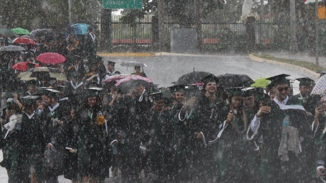 Una imagen compartida en la página de Facebook Hub Colegial muestra una fila de graduandos mojándose debajo del aguacero que cayó en la zona del municipio del oeste.