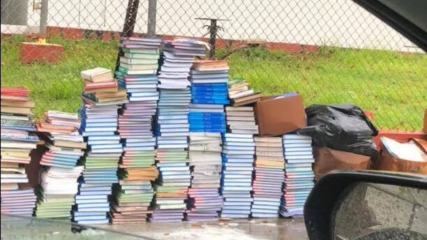 Cientos de libros amanecen mojados y abandonados frente a escuela