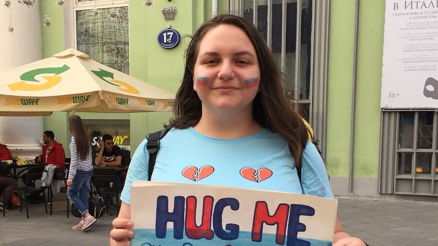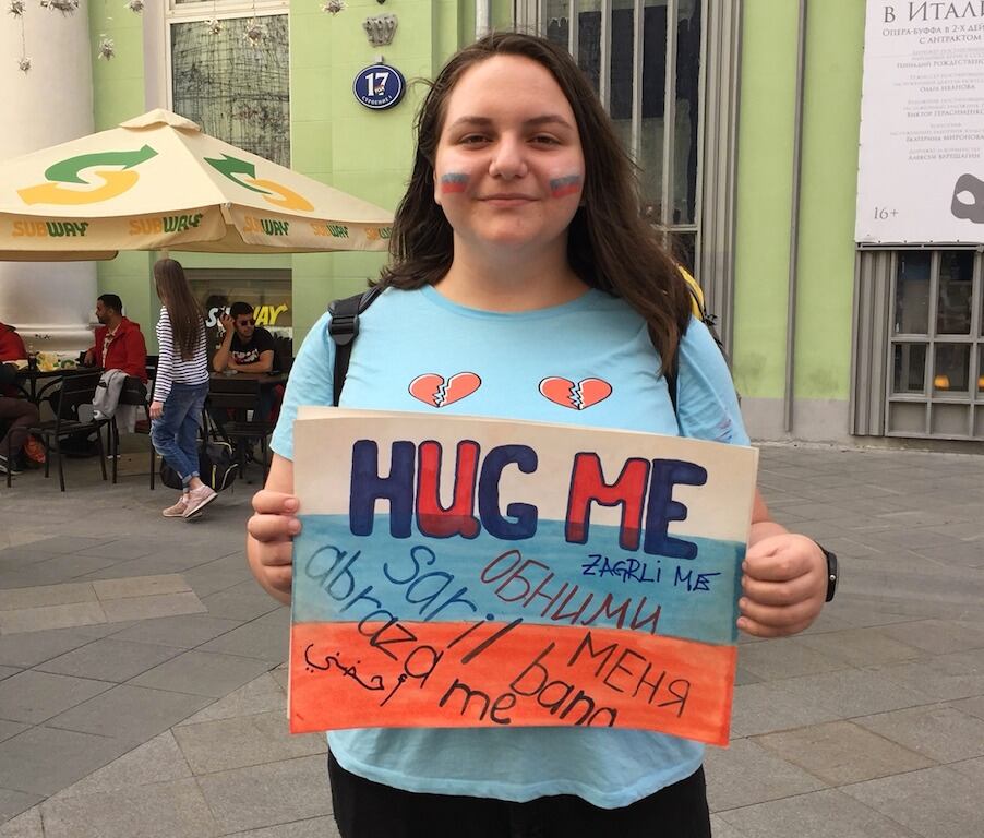 La calle Nikolskya, en el centro de Moscú, que ya se ha convertido en un lugar no oficial de encuentro entre los aficionados internacionales que acuden a la capital de Rusia para asistir a la Copa Mundial, también atrae a las chicas locales que buscan hacer nuevos amigos. Rodeada por el ruido de cantos y gritos, María Mikhailova, estudiante de 16 años, está de pie en silencio con sus dos compañeros de clase sosteniendo un póster de “Abrázame” escrito en diferentes idiomas. #HOMEALONe conversó con Mikhailova para saber más.