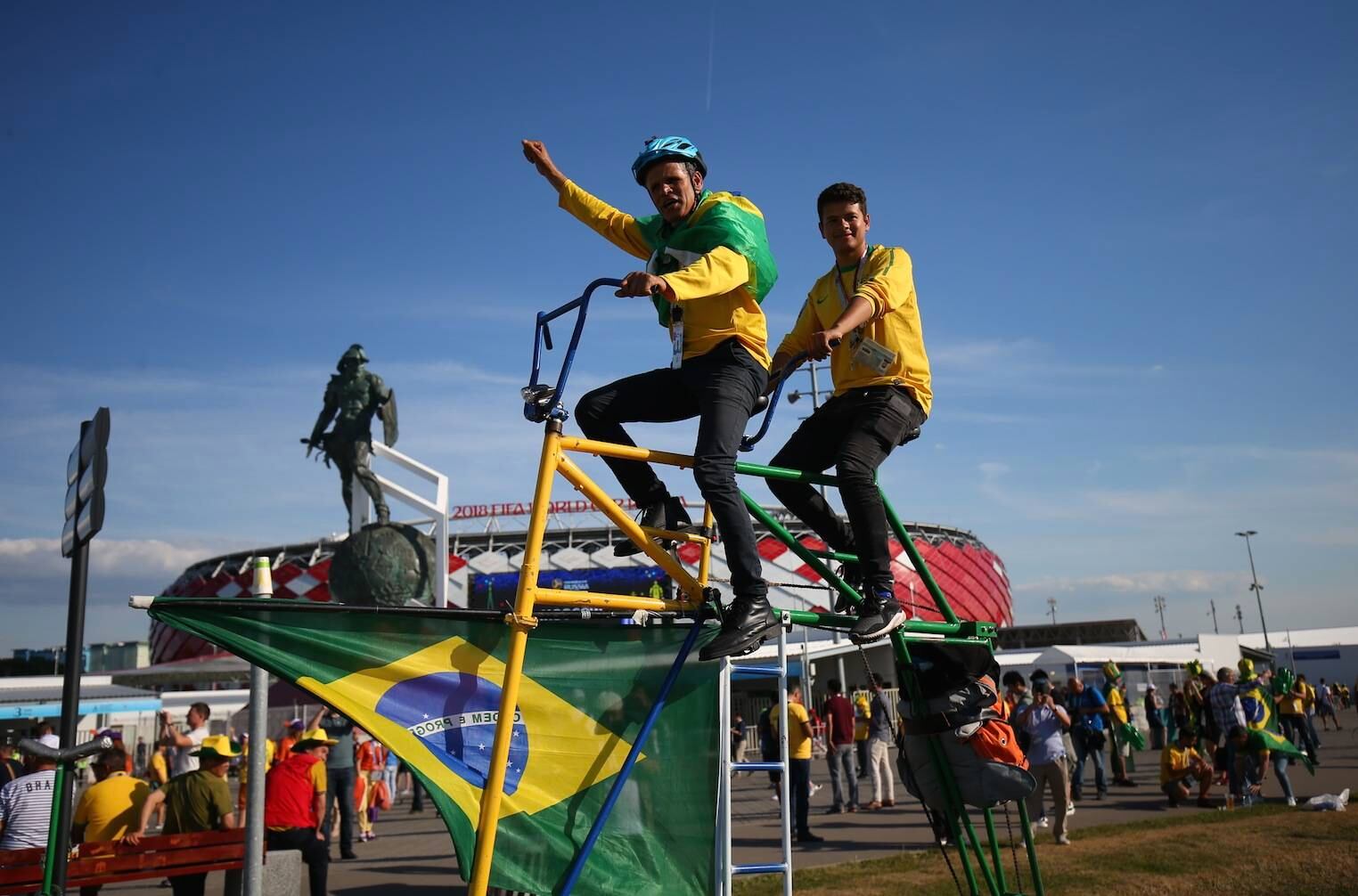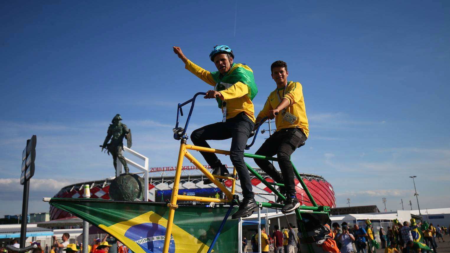 El fabricante de bicicletas Elias de Souza Aguilar, de 52 años de edad, y su hijo Elias de Souza Jr. de 27, llevaron un vehículo impresionante al torneo de fútbol en Rusia.