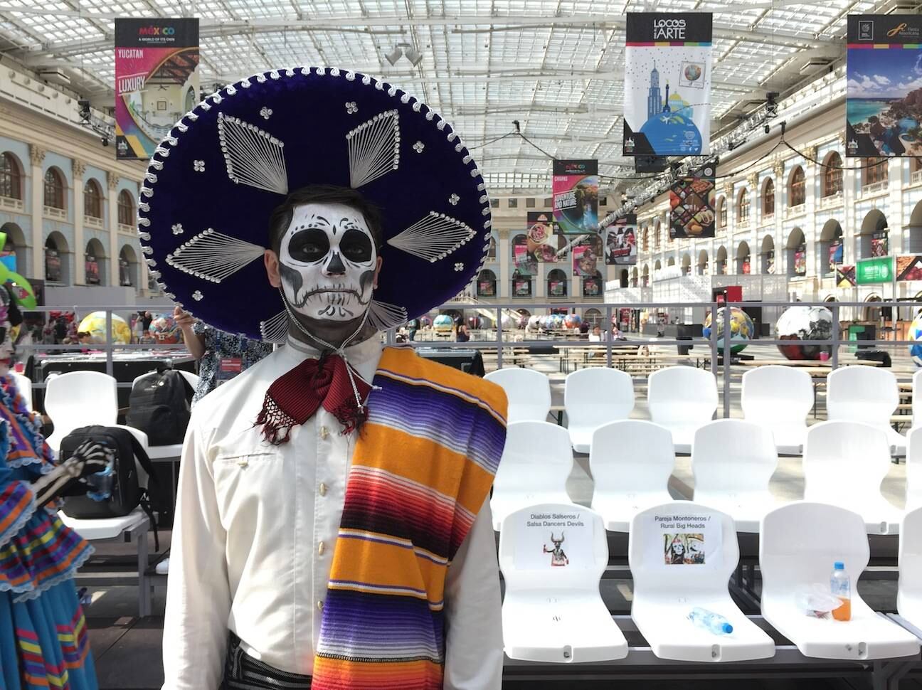 Artistas disfrazados con rostros de esqueletos actuando y bailando para mostrar el ambiente de la fiesta a los visitantes del torneo se vio en el espacio mexicano en Moscú.
