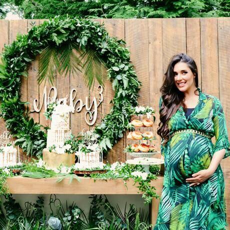Vega aún no ha confirmado el sexo del bebé, por lo que se pudo observar que la decoración era bastante neutral. La modelo lució un vestido verde con figuras de hojas de palmera muy acorde con el tópico de la festividad realizada al aire libre.