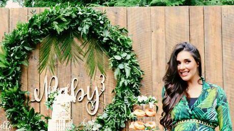 La exmiss Universo Amelia Vega celebró el ‘baby shower’ de su tercer hijo inspirado en la naturaleza, con una mesa decorada destacando el verdor en cada recurso utilizado para embellecer la celebración: una gigante corona, plantas por doquier, varios pasteles y un letrero identificando que es el “Baby 3”.