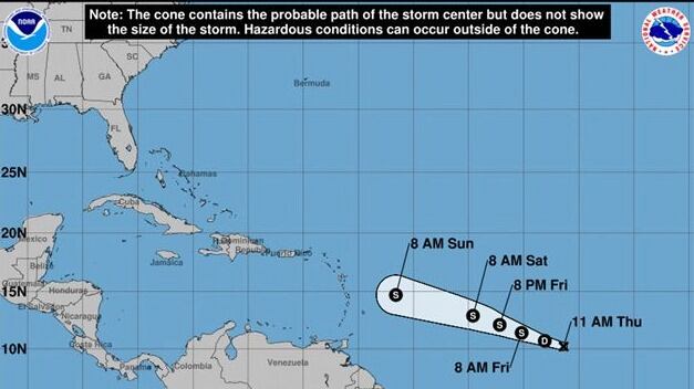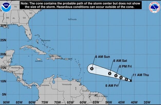 En el boletín de las 11 de la mañana se informó que el sistema tiene vientos sostenidos de 39-73 mph y se mueve hacia el oeste a 16 millas por hora.