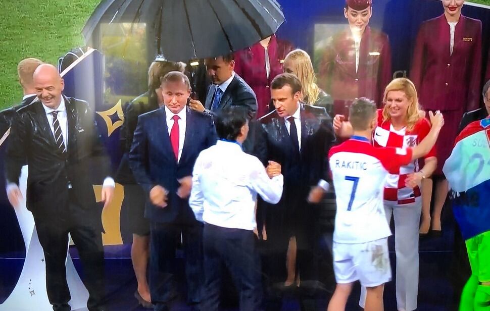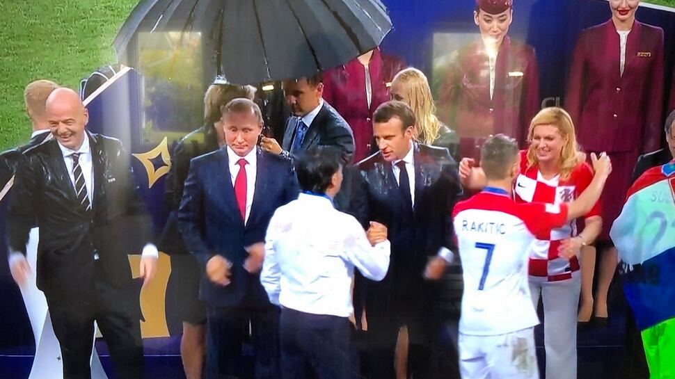 Los dos equipos esperaron ante las autoridades mientras el agua se convertía en algo incómodo para todos menos para Vladímir Putin. La polémica por la sombrilla en la final del Mundial.