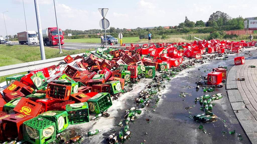 El vocero policial de la localidad de Prudnik, Andrej Spyrka, dijo que el cargamento de cerveza de las marcas Holba y Litovel estaba mal sujetado y provocó el vuelco del camión cuando recorría una glorieta el martes por la tarde. No hubo heridos y el tráfico volvió a la normalidad cinco horas después.