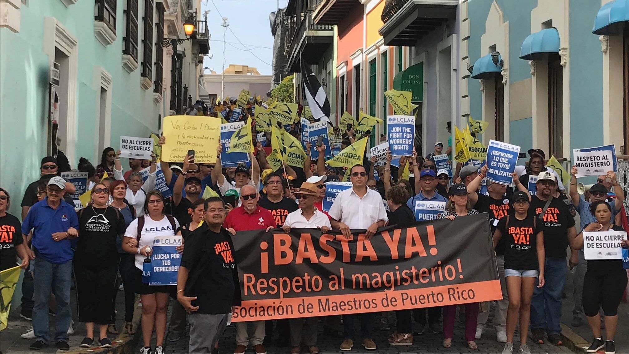 “Destruyeron nuestro sistema de retiro, nos quitaron nuestro derecho a la permanencia y ahora nos quitan las escuelas y en vez de escuelas, tenemos vagones”, expresó dirigiéndose a la multitud, en referencia al establecimiento de unos 40 trailers temporeros por parte del DE para dar clases mientras se completa el proceso de consolidación de las 266 escuelas cerradas a finales del pasado año escolar.