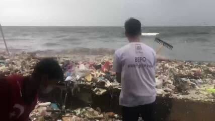 En el video se puede ver como olas de basura llegan hasta los voluntarios lanzando botellas y demás clase de residuos.