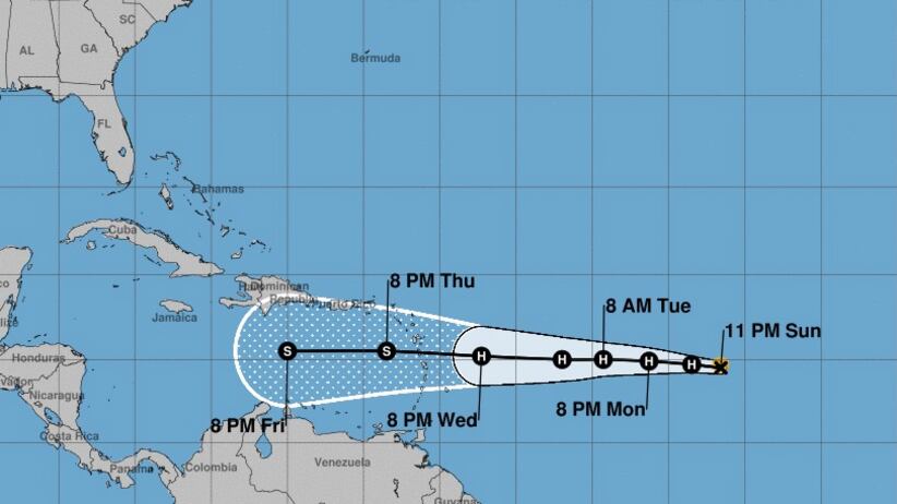 El boletín completo de las 11:00 de la noche ubicó el centro del huracán cerca de la latitud 14.5 norte y longitud 41.6 oeste.