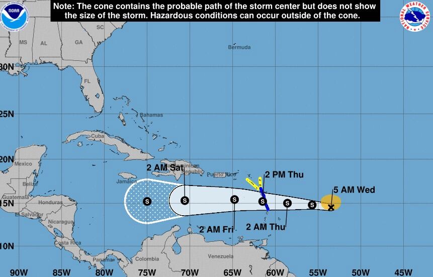 A las 5:00 de la madrugada, el sistema estaba en la latitud 14.5 grados norte, longitud 53.5 grados oeste con un movimiento al oeste a cerca de 16 millas por hora (mph).