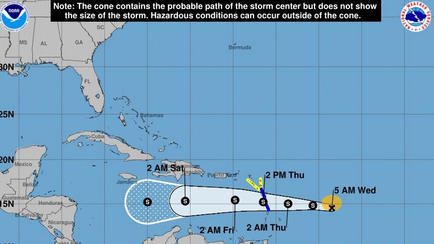 Entretanto, señala que un aviso de tormenta tropical fue emitido para Martinica, Dominica y Guadalupe. Una vigilancia de tormenta tropical está vigente para Antigua, Montserrat, St. Kitts and Nevis y Saba and St. Eustatius.