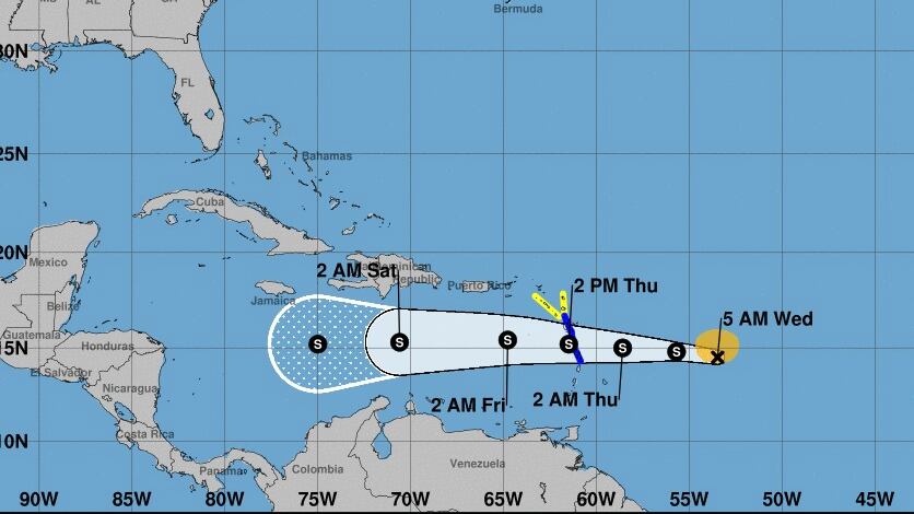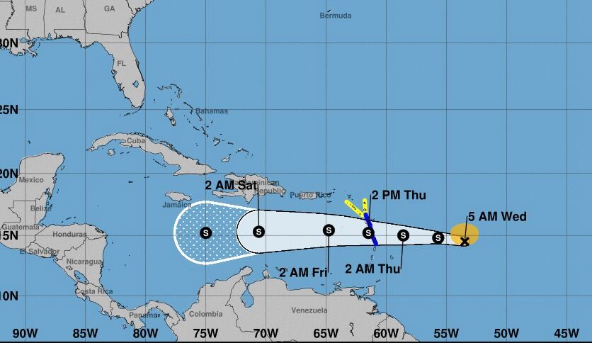 El boletín de las 11:00 de la mañana coloca al fenómeno atmosférico en la latitud 15.0 grados norte, longitud 54.7 grados oeste con vientos de 60 millas por hora.