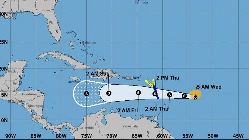 Asimismo, el informe detalla que se podrían registrar entre una y dos pulgadas de lluvia y cantidades aisladas de hasta cuatro pulgadas en Puerto Rico y las Islas Vírgenes Estadounidenses sureñas con hasta un centímetro anticipado en las restantes Islas de Barlovento y de Sotavento.