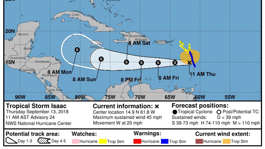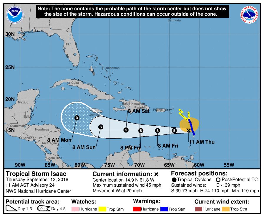 “A medida que las bandas externas de la tormenta tropical Isaac se muevan más cerca del área de pronóstico, chubascos y tormentas con algunos vientos racheados comenzarán a afectar a las islas locales tan temprano como esta noche y temprano el viernes. La actividad de lluvia y truenos se espera sea más frecuente a mediados de la mañana el viernes y continuando hasta al menos el viernes por la noche”, indica la alerta del SNM.