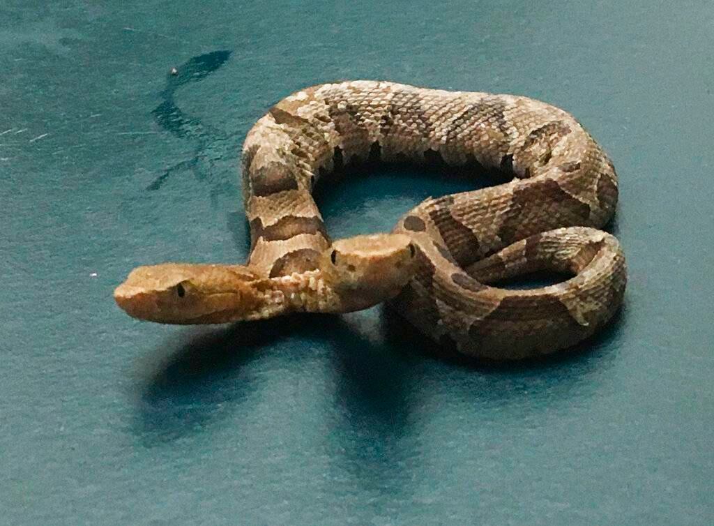 El Centro de Vida Silvestre de Virginia dijo que la serpiente cabeza de cobre oriental de dos cabezas fue encontrada en un vecindario del norte de Virginia la semana pasada. Indicó que un herpetólogo estatal la llevó al hospital el jueves para un examen.