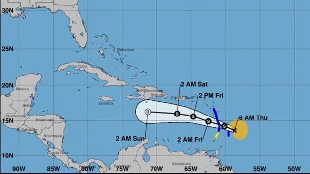 Si sigue su rumbo actual, el ojo de la tormenta pasará por las Antillas Menores el jueves por la noche. Los meteorólogos esperan que se debilite gradualmente a depresión tropical tras cruzar las islas.