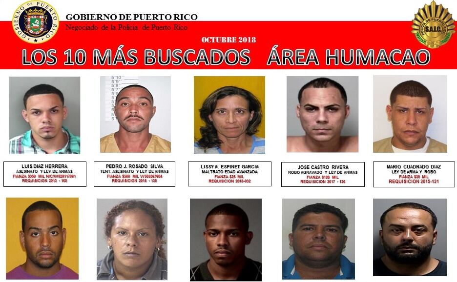 Los otros cinco buscados son Yismell Marcano Nazario por robo; Sheila M. Ramos Cruz por robo; Samuel Rosario Borrero por Ley de Armas y violencia doméstica; Jeovanny Santana Santana por violencia doméstica; Noel Morales Morales, también por violencia doméstica.