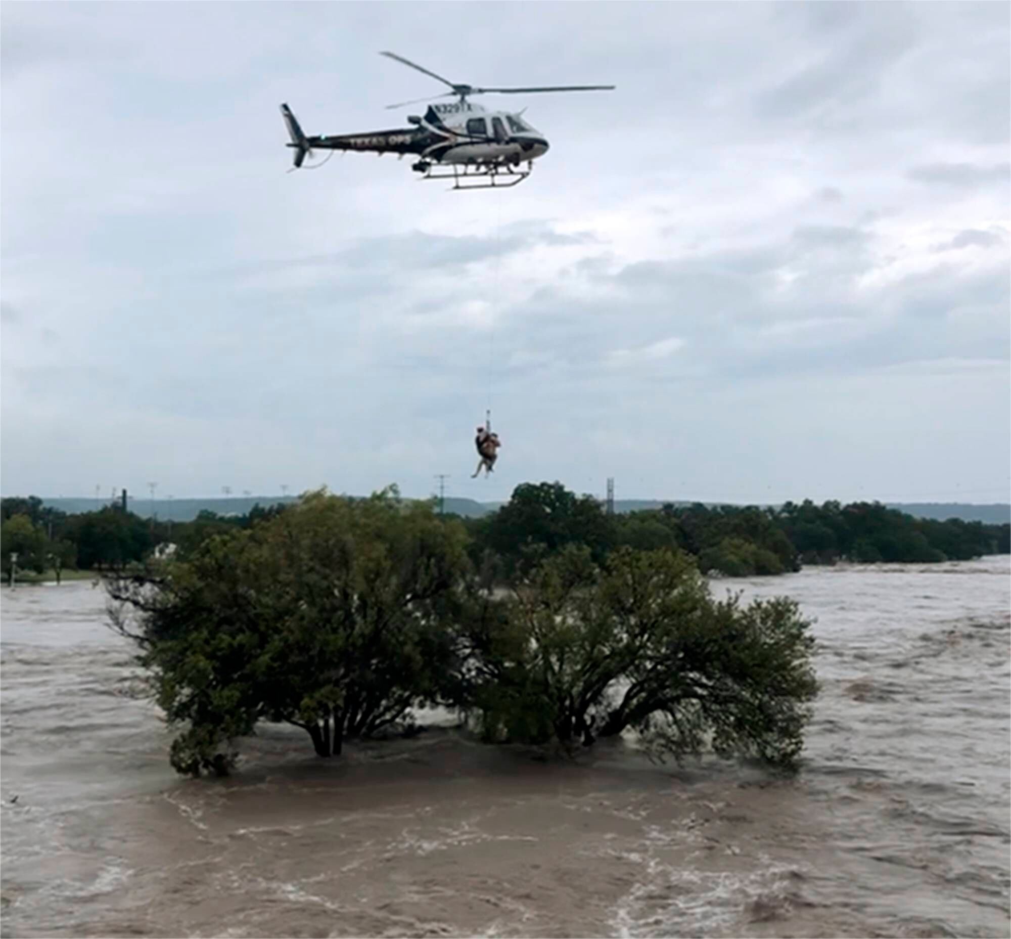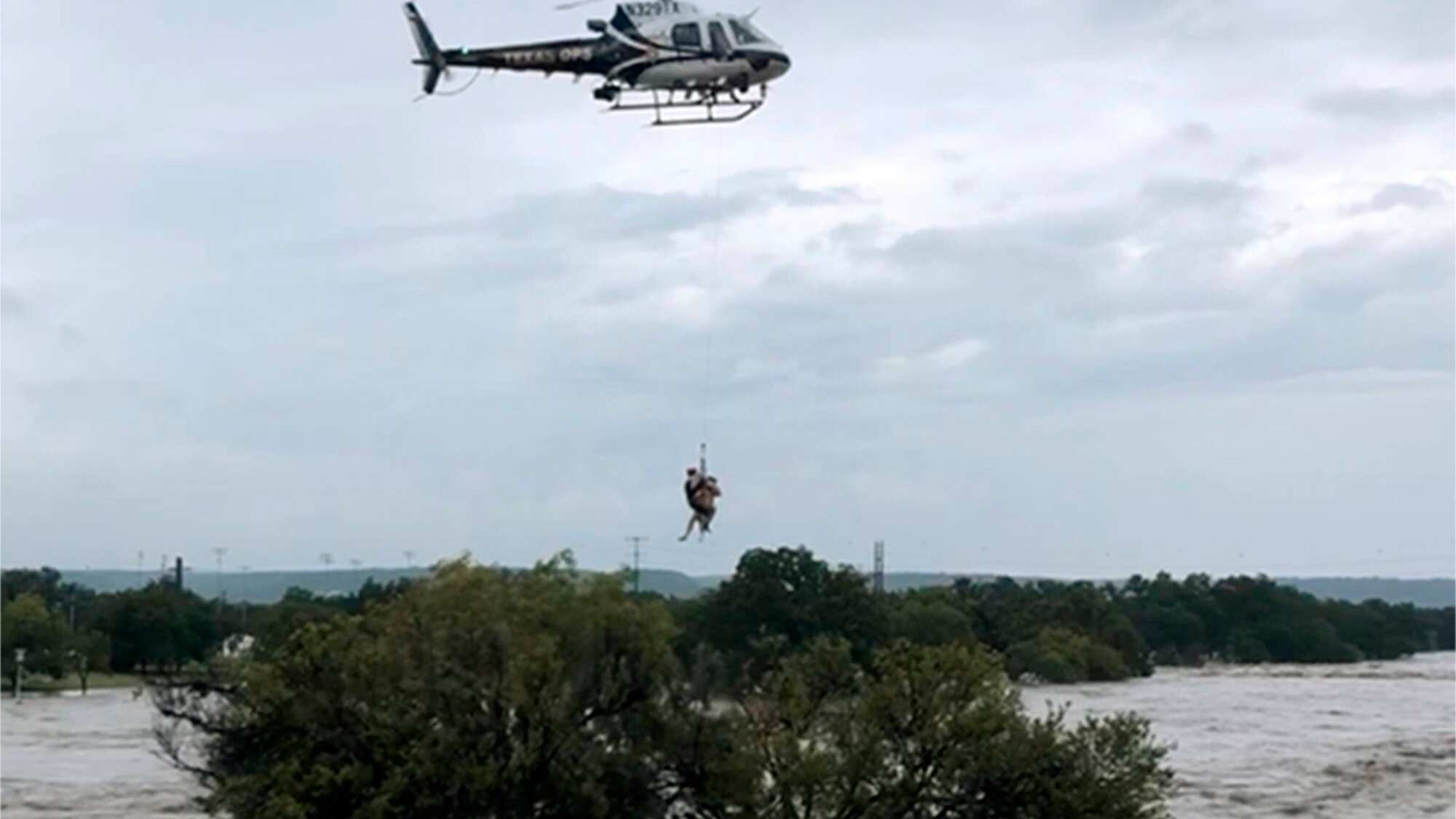 A través de Twitter, la Comisión de Cacería de Texas dijo que se realizaban rescates con helicóptero en el río. La agencia reportó que dos personas y un perro fueron puestos a salvo después de que la corriente arrastró su casa rodante.