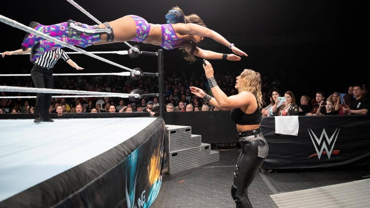 En el registro se ve como tras la embestida de la galesa, apenas logra ponerse de pie afirmándose en Ripley, demostrando en su rostro el dolor y frustración que sentía. Incluso, golpeó con furia a las escaleras, mientras la jueza del match se le acerca para preguntarle por su estado.