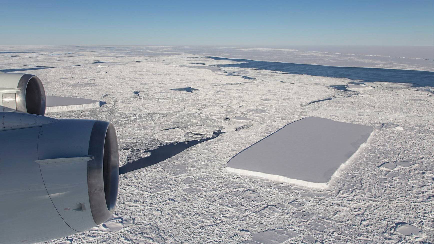 “En realidad estaba más interesado en capturar el iceberg de la A68 que estábamos a punto de sobrevolar, pero pensé que este iceberg rectangular era visualmente interesante y bastante fotogénico, así que en una alondra, sólo tomé un par de fotos”, declaró el científico de apoyo de IceBridge, Jeremy Harbeck.