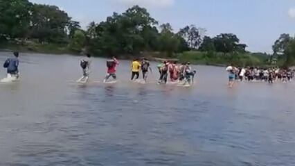 La marina mexicana ha comenzado a patrullar el río y la policía mexicana ha tomado posiciones en la orilla del río, insistiendo en que los migrantes se registren antes de ingresar y muestren documentos de viaje que muchos no tienen. Se vio un helicóptero sobrevolando varios cientos de migrantes que habían cruzado el río, aparentemente utilizando la corriente descendente de sus rotores para desalentarlos. El lunes temprano, unos 600 inmigrantes se habían reunido en el puente, donde la policía federal mexicana había bloqueado un extremo. El domingo, los migrantes rompieron las barreras fronterizas en el lado guatemalteco del puente, solo para enfrentar a la policía mexicana, quien les impidió ingresar a México. Video: AP.