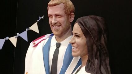 Lara Mason, de 32 años, de Brownhills, West Mids, diseñó minuciosamente el pastel para la boda de la pareja en mayo, pero desde entonces ha añadido una bomba para bebés, un libro y una bolsa. La enorme esponja, que puede alimentar a 1,000 personas, fue una de las atracciones estrella de este año en el show Cake International en el NEC de Birmingham. Lara dijo que se inspiró para crear la representación azucarada de la pareja real antes de la boda real de este año. El pastel, que está cubierto de mazapán, se hizo con esponja de vainilla y crema de mantequilla de vainilla, con Lara enlistando 20 kilos de azúcar para elaborar la dulce creación. Dijo: “Era mi mayor desafío hasta la fecha. Las caras eran la parte más difícil y a mitad de camino, me preocupaba que no tuviera ninguna imagen”. El pastel, que mide seis pies y medio de altura, no es el primer pastel de Lara con un toque real. Video: AP