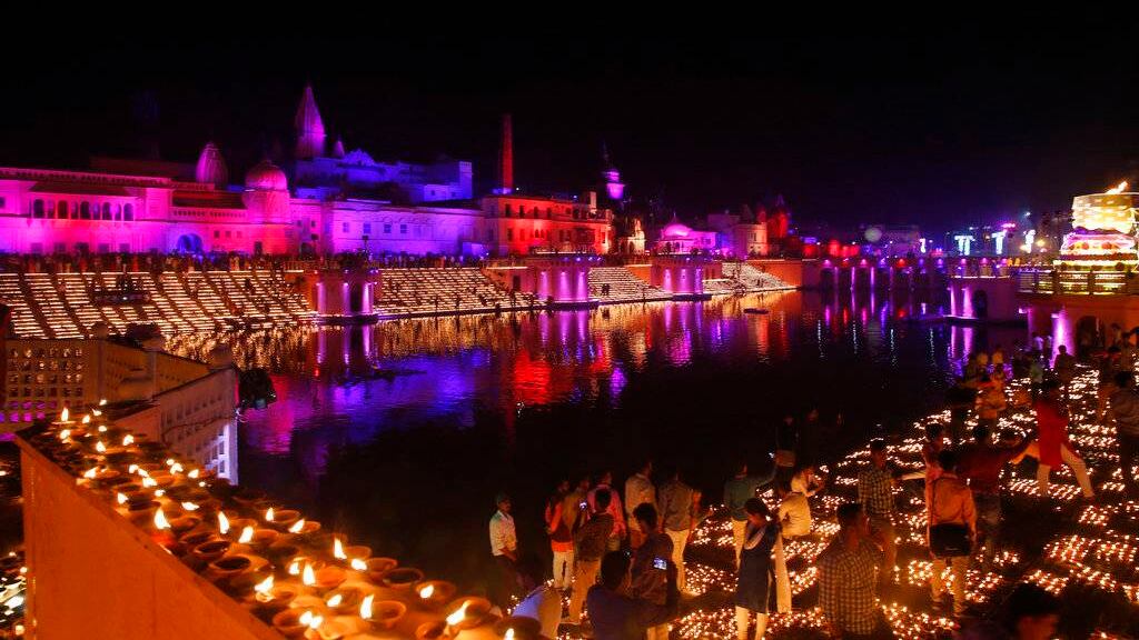 Al caer el anochecer en Ayodhya, en donde los hindúes creen que el dios Rama nació y a donde regresó tras 14 años en exilio, voluntarios alumbraron las lámparas, llamadas diyas, que serpenteaban a lo largo del río, a través de calles y en casas.