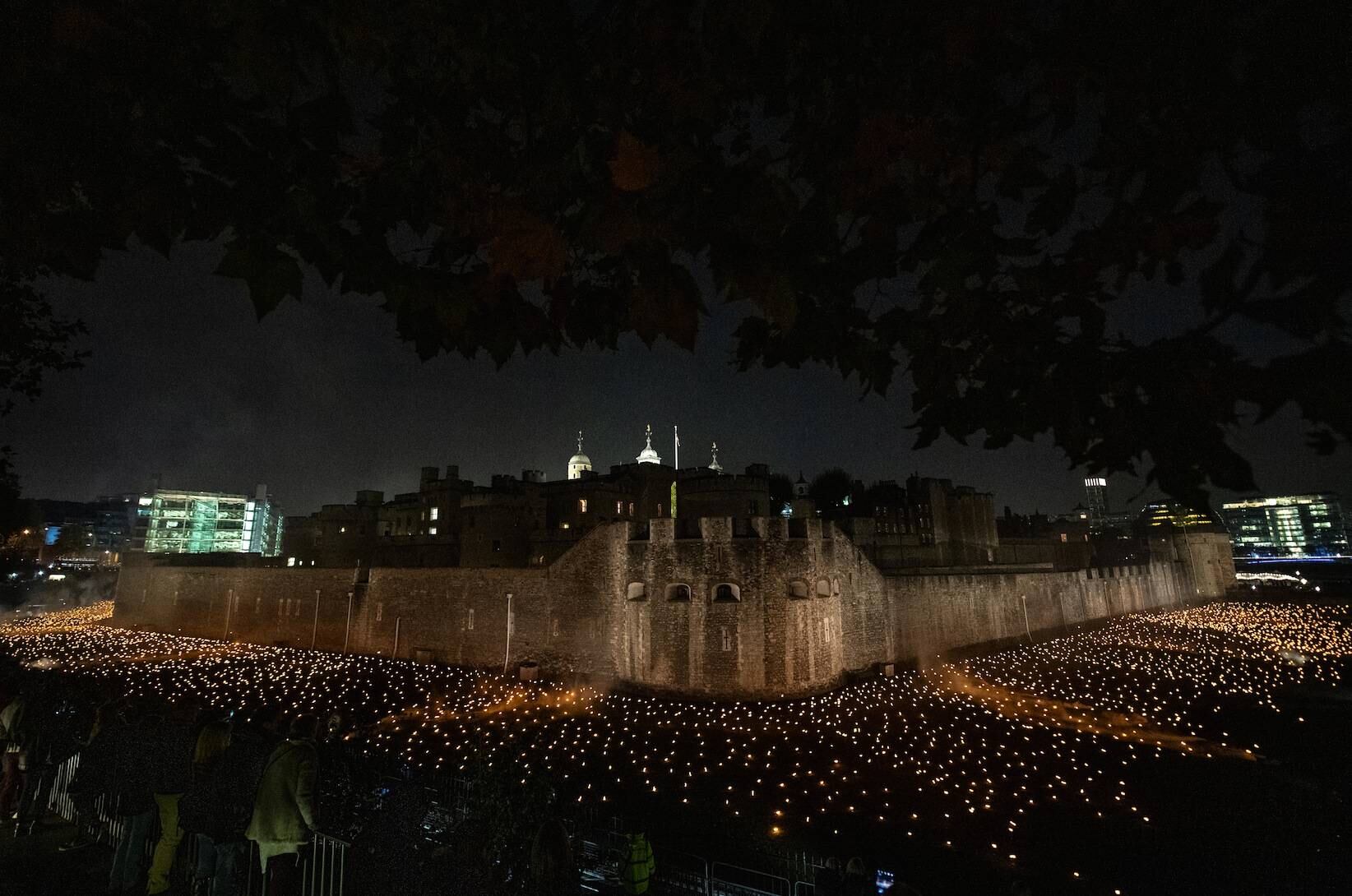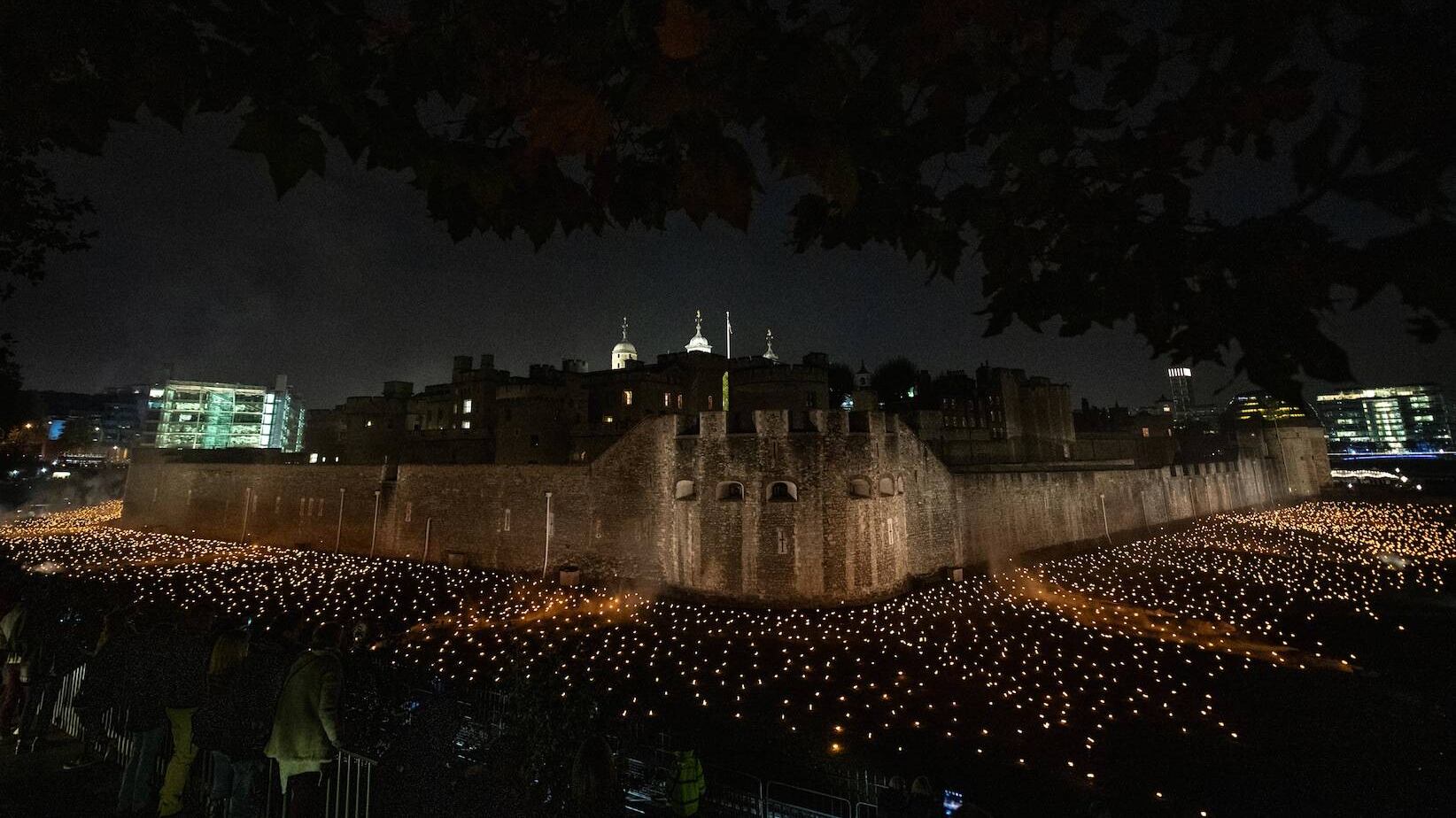 flamas son utilizadas por la instalación de la Torre de Londres para conmemorar el centenario del final de la Primera Guerra Mundial.