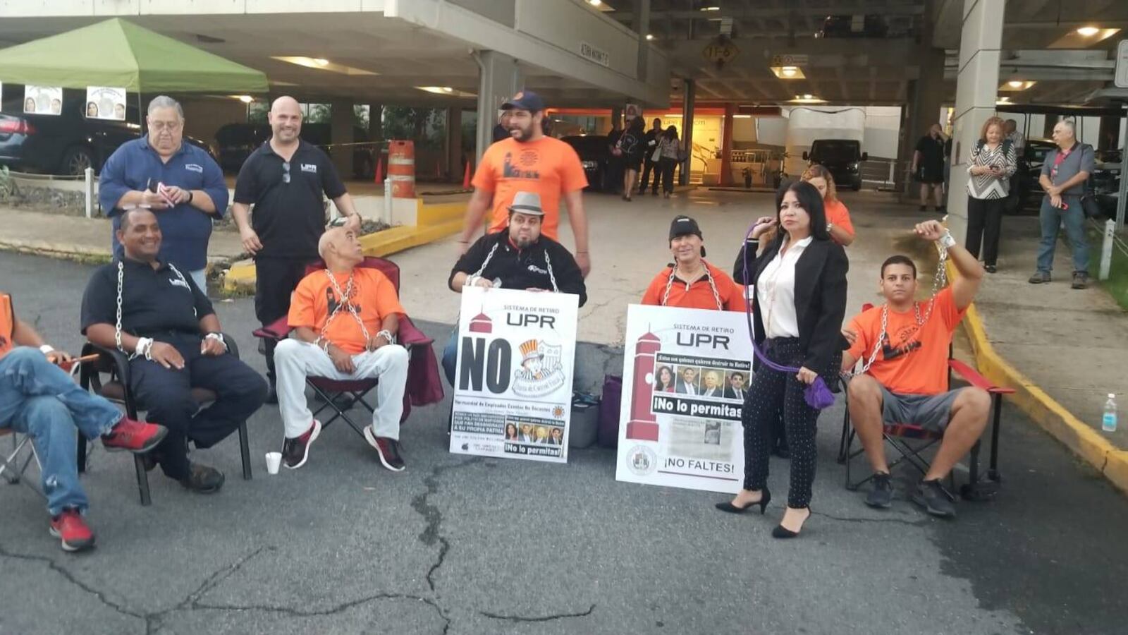 Trabajadores de la Hermandad de Empleados Exentos No Docentes (HEEND) y del Sindicato de Trabajadores del Recinto de Ciencias Médicas (RCM) se encadenaron la mañana del miércoles frente a la entrada del recinto para representar lo que ellos entienden es el “secuestro de su sistema de retiro” por parte de la Junta de Gobierno de la Universidad de Puerto Rico (UPR).
