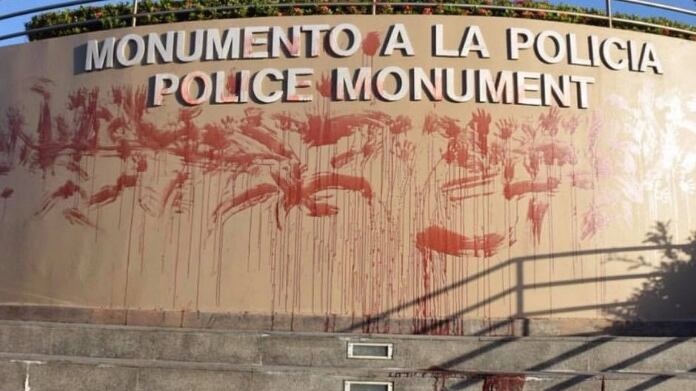 Miembros de Colectiva Feminista en Construcción se manifestaron contra la violencia machista pintando de rojo varios monumentos en San Juan.