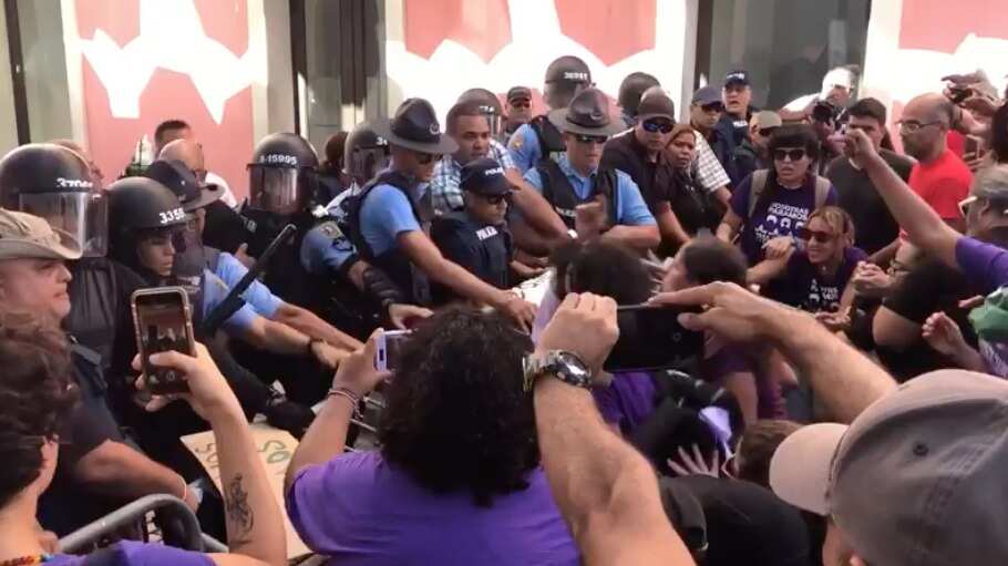 Durante un protesta en el marco del día de no más violencia contra las mujeres, decenas de manifestantes de la Colectiva Feminista en Construcción y oficiales de la Policía tuvieron un altercado frente a la entrada de La Fortaleza.