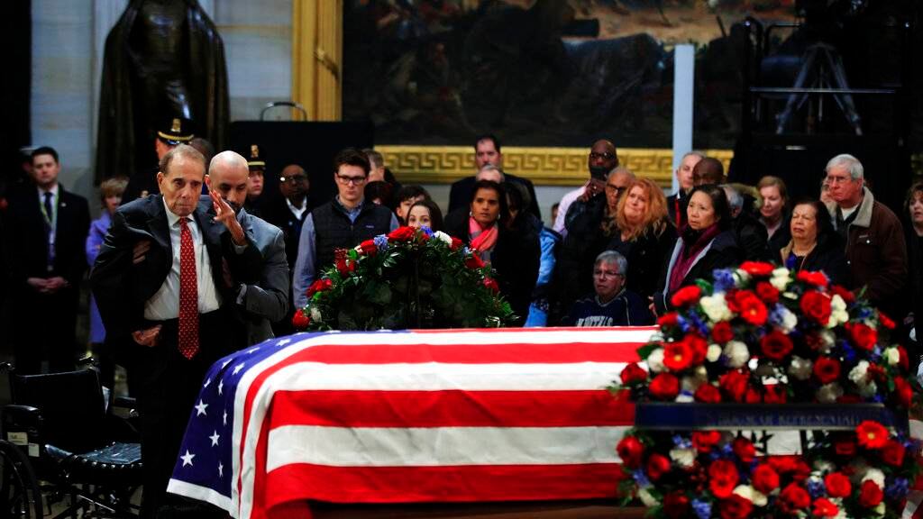 La congregación, en la que se encontraban gobernantes extranjeros y diplomáticos, estadounidenses de puestos jerárquicos y otros que estuvieron relacionados con el difunto, se puso de pie al arribo del féretro, acompañado por clérigos de distintas confesiones. En la fila que ocupaban, el presidente Donald Trump, los expresidentes Barack Obama, Jimmy Carter y Bill Clinton, junto con sus cónyuges, pusieron la mano sobre sus corazones.