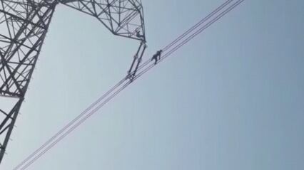 Un hombre indio tuvo que ser rescatado después de arriesgar su vida caminando sobre un alambre de alta tensión en Bulandsahar, Uttar Pradesh. Las imágenes muestran al hombre supuestamente borracho parado en el cable suspendido a gran altura. Los testigos del peligroso truco llamaron a la policía que llegó rápidamente al lugar y lograron rescatar al hombre después de una hora de tensas negociaciones. El incidente ocurrió el 5 de diciembre. Según los medios locales, el hombre caminó por el cable en un intento de suicidarse. Video: Reuters.