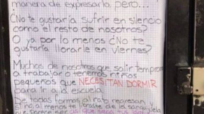 La joven había llorado y gritado durante varias madrugadas debido que su novio decidió ponerle fin a la relación. Los vecinos cansados de la situación le dejaron una curiosa nota en la puerta de su departamento.
