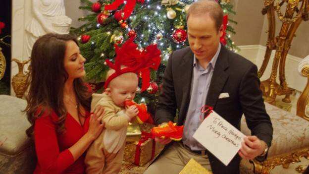 Como se esperaba, las verdaderas estrellas de la foto son la prole real: Prince George, 5, Princess Charlotte, 3, y Prince Louis, siete meses. El hermano mayor de Cambridge, vestido con un suéter, pantalón azul y pequeñas botas de deporte, posa ridículamente en una rama de árbol mientras sostiene los hombros de su padre.