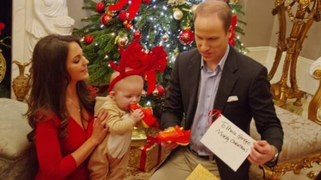 La princesa Charlotte sonríe astutamente mientras está parada entre sus padres con un suéter azul de punto, una falda azul oscuro y botas. Mientras tanto, el príncipe Louis se ve lindo como un botón en los brazos de su madre, vestido con un suéter azul claro, pantalón azul marino, medias y zapatos pequeños.