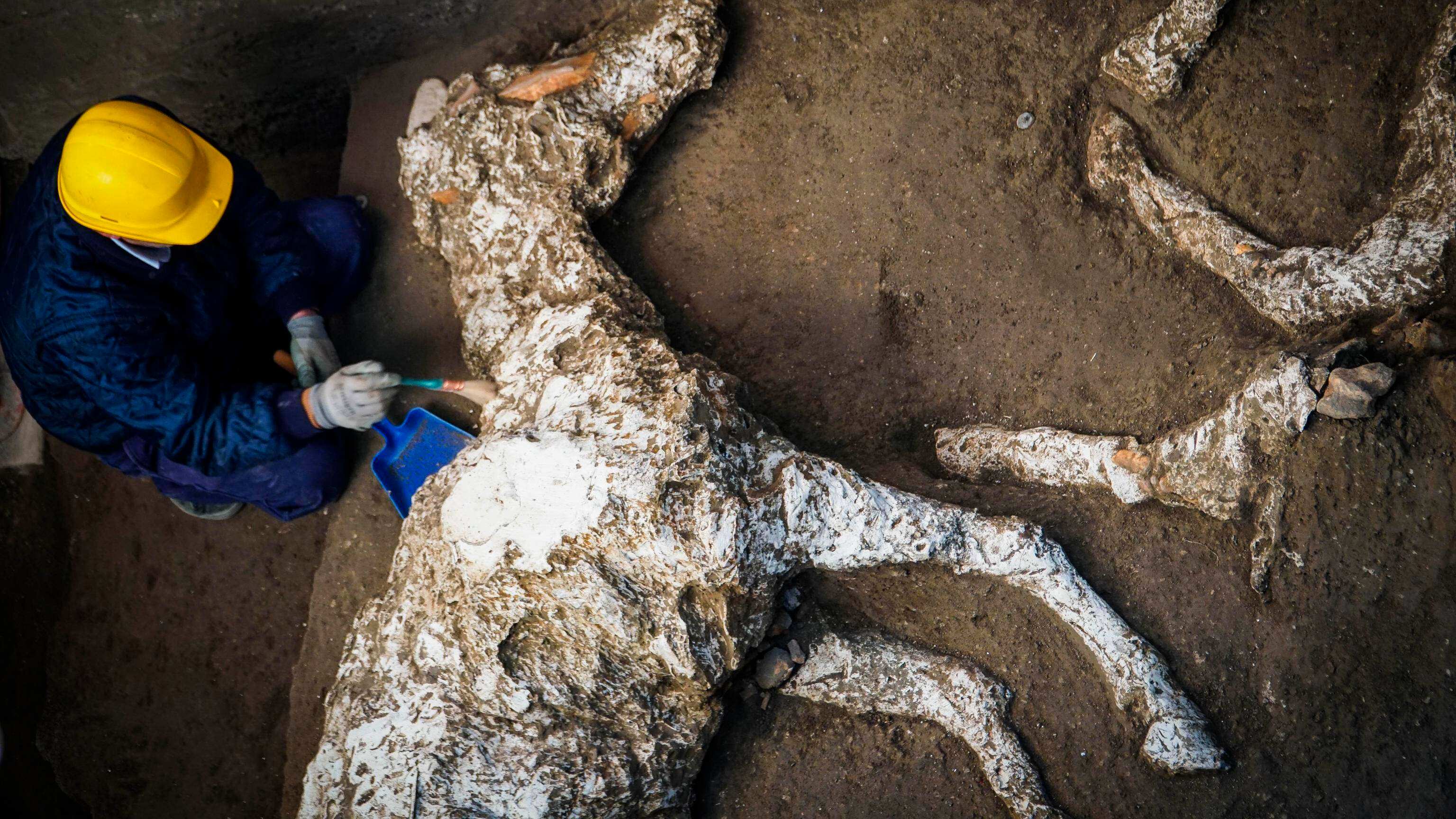 Un grupo de arqueólogos descubrió los restos petrificados de un caballo con arnés y montura en el establo de una villa antigua en un suburbio de Pompeya.