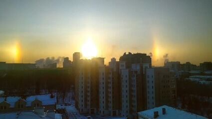 A medida que el tiempo avanzaba la ilusión óptica que asemeja tres soles se difuminaba. Los halos son fenómenos ópticos producidos por la luz solar que interactúa con los cristales de hielo en la atmósfera. Video: Ruptly.