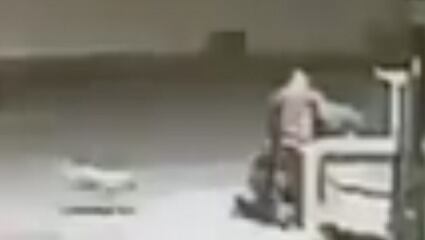 Cuando el trabajador se encuentra en el piso, el perro corre contra los agresores, quienes se alejan poco a poco del lugar sin el botín.