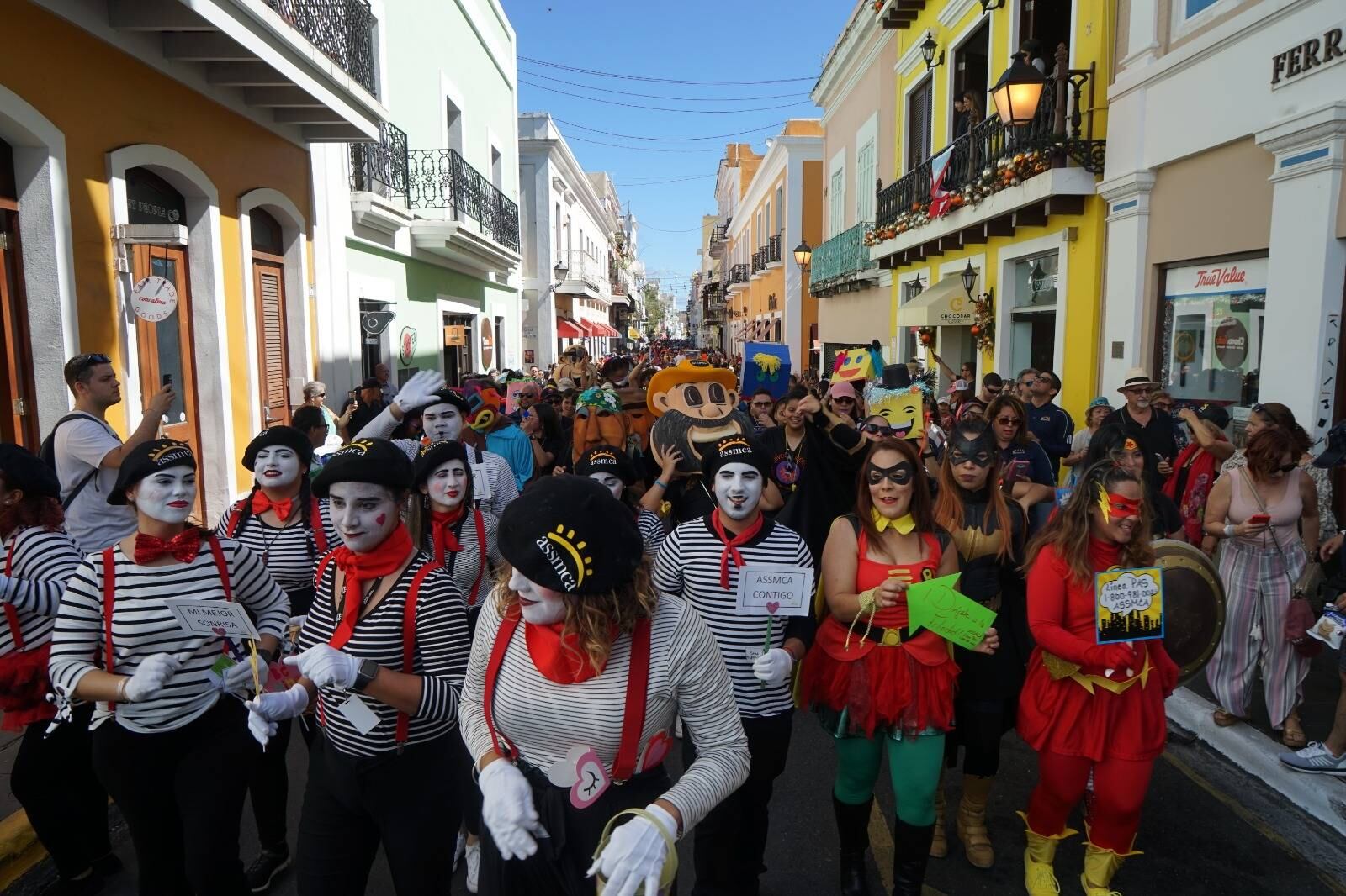 Integrantes de la Organización Nacional de Jóvenes Líderes de la Administración de Servicios de Salud Mental y Contra la Adicción (ASSMCA), discurrieron hoy por las Fiestas de la Calle San Sebastián y lugares aledaños con una colorida e impresionante comparsa, que incluía vejigantes, cabezudos, mimos y hasta superhéroes.