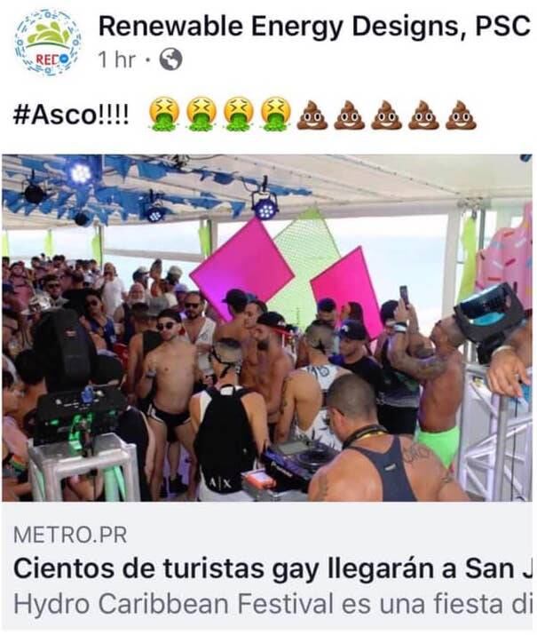 La compañía Renewable Energy Design PSC con sede en Arecibo, compartió el jueves una publicación en la que se anunciaba la celebración del Hydro Caribbean Festival dirigido a la comunidad LGBTT, acompañado de un mensaje que leía “#Asco” y que ha sido denunciado en las redes sociales como un acto de homofobia y discriminación.